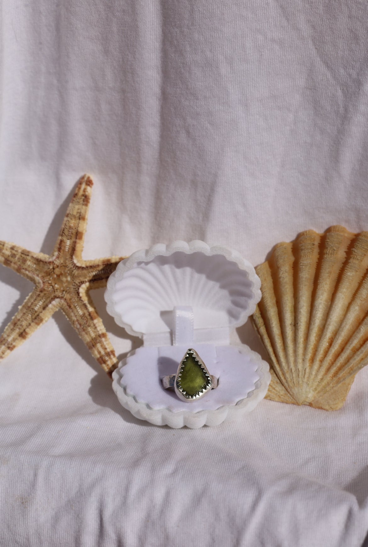 This ring is a size 8 and features a gorgeous piece of green sea glass. Featuring the unique spiky bezel, it is the perfect statement piece! All of our rings are handcrafted with 925 silver, passion and all the love in the world.